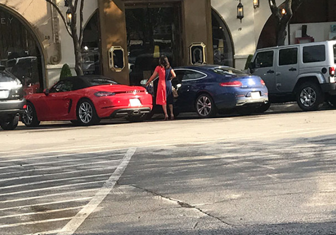 12. En kvinna som bär en klänning som även matchar bilarna.