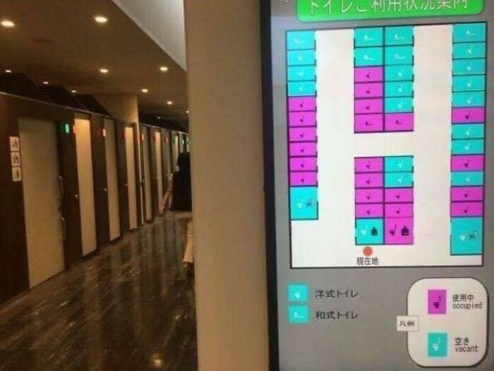 5. Flera offentliga toaletter är utrustade med en digital karta som visar vilka toalettbås som är upptagna och vilka som är lediga.