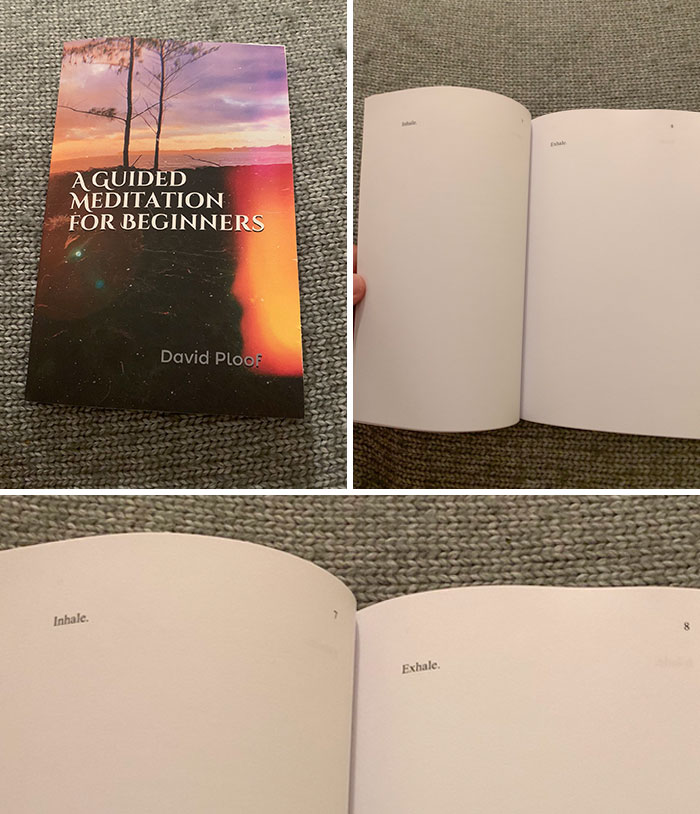 1. ”Jag köpte en meditationsbok från Wish och på varje sida står det bara ”Andas in” och ”Andas ut”. Sjukt besviken!”