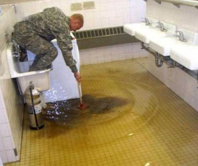 1. Militärer är tuffa och klarar allt – förutom en översvämning på toaletten! Då är det reträtt som gäller!