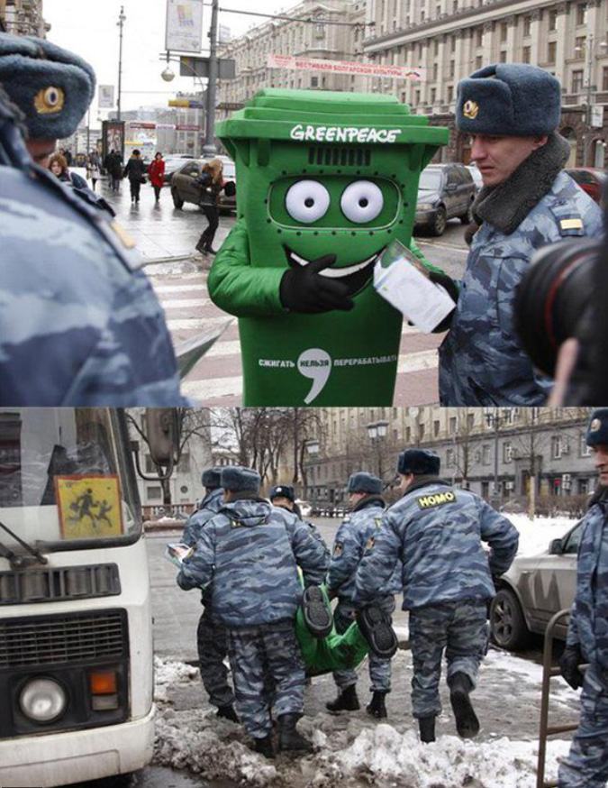 3. Den här Greenpeace-aktivisten som blir bortburen av den ryska polisen – med det lite udda namnet på ryggen.