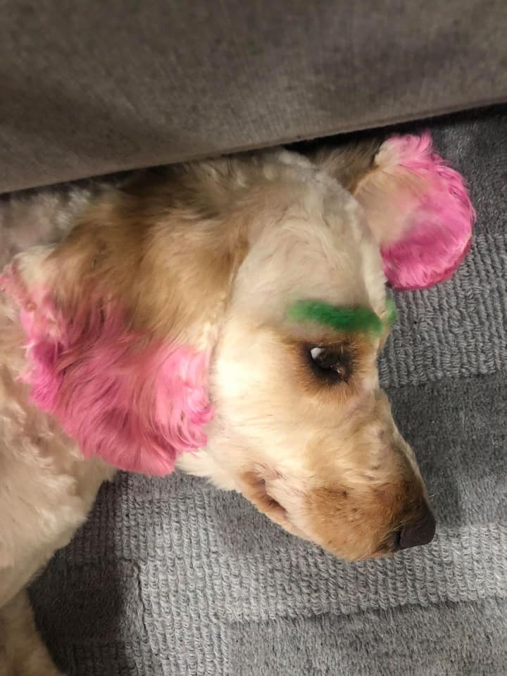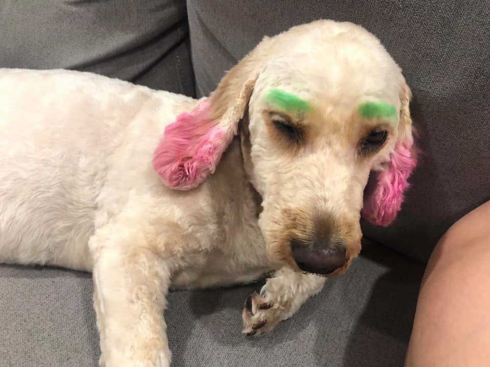Hundfrisören försvarade det hela med att förklara att de av misstag hade rakat bort hennes ögonbryn och försökte fixa det genom att färga ögonbrynen gröna.