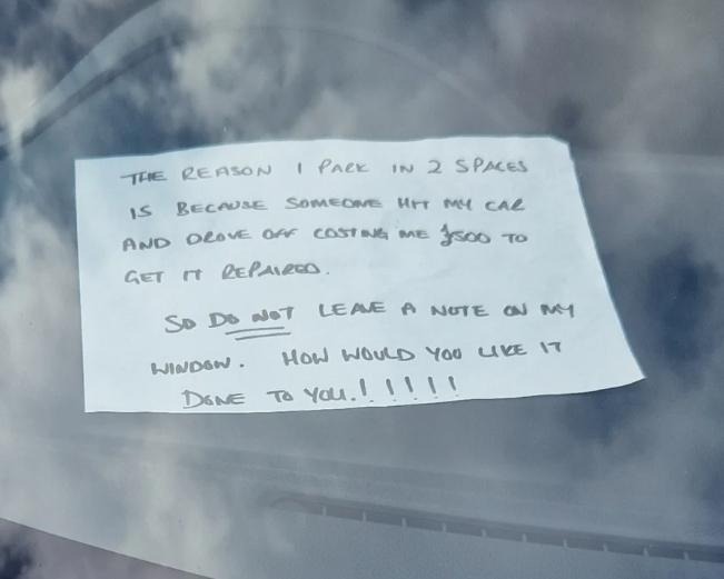 ”Anledningen till att jag parkerar på 2 platser är för att någon slog min bil och körde iväg, vilket kostade mig 500 pund för att få det fixat. Så snälla lägg inte en lapp i mitt fönster. Hur skulle du vilja det om det hände dig. ” Ordet ”inte” var understruket två gånger, vilket indikerar att personen inte var intresserad av att ingå en skriftlig konversation om detta ämne.