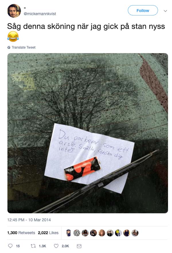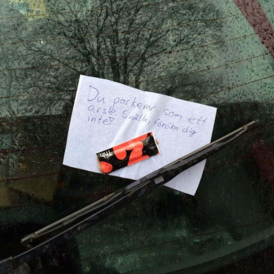 ”Du parkerar som en idiot, snälla, föröka dig inte.” Och vid lappen i fönstret satte han en kondom.