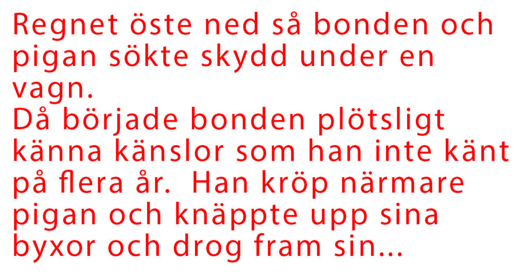 Det var fortfarande en bra bit hem så att gå hem var uteslutet. För att slippa undan ösregnet kröp bonden och pigan ihop under vagnen för att få skydd mot regnet.
