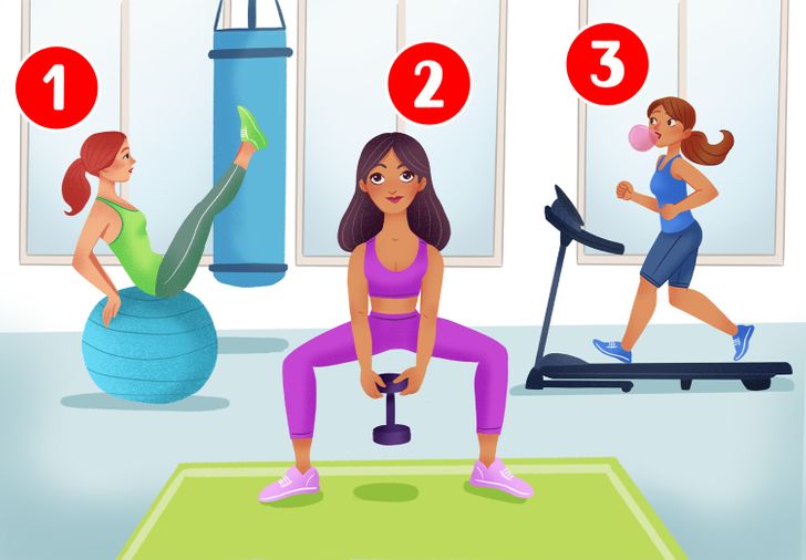 Dags att se om du gissat rätt. Vem tror du svävar i fara, kvinnan på balansbollen, kvinnan som lyfter en hantel eller den tredje kvinnan, på löpbandet?