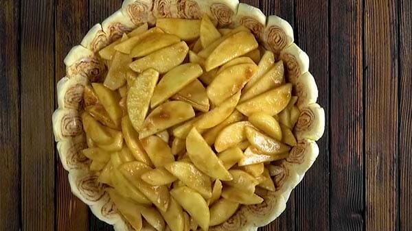 11 Lägg äppelbitarna i en skål med socker, kanel och mjöl. Blanda väl.