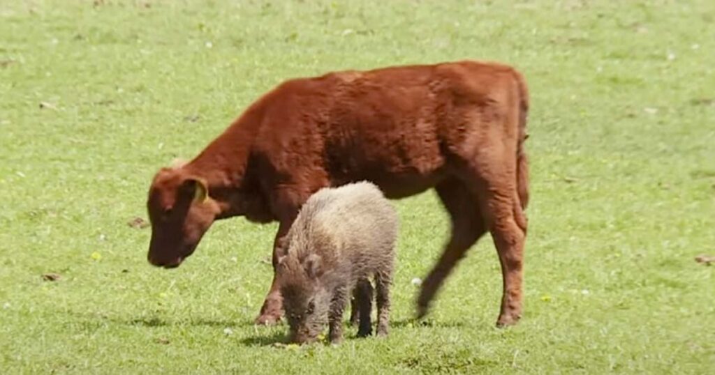En ko i Tyskland har fått en osannolik vän, efter att flocken ”adopterat” en ensam liten vildsvinsunge.