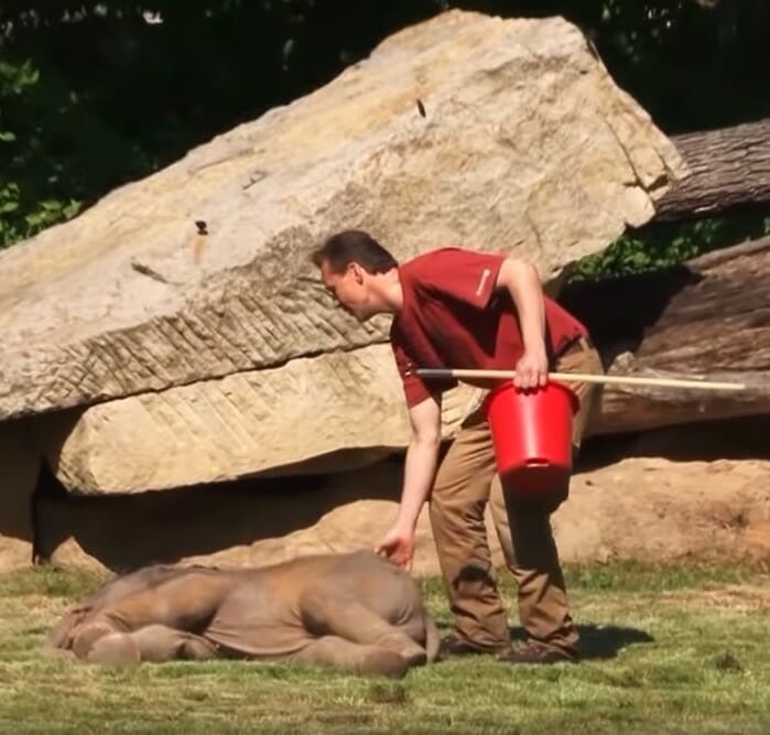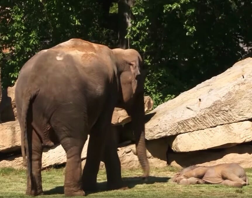 En av djurskötarna försöker väcka elefantungen genom att klia sig hårt på rumpan. Det tar ett tag, men så småningom vaknar han och studsar upp. Man hör hur åskådarna släpper loss ett lättat ”Aaaaaaaah”.