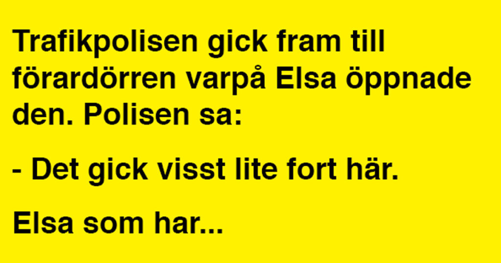 Gunnar och Elsa var ute på en söndagstur med sin gamla Saab när de blev stannade i en poliskontroll. Trafikpolisen gick fram till förardörren varpå Elsa öppnade den. Polisen sa: