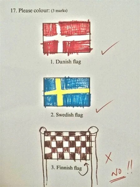Den danska och svenska flaggan verkade ganska lätt för eleven, men problemen uppstod när eleven skulle rita den finska flaggan. Du kommer säkert att skratta när du ser detta hysteriskt roliga svar och teckningen av flaggan.