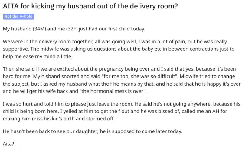 Kvinnan börjar med att förklara: ”Vi var på förlossningsrummet tillsammans och allt gick bra. Jag hade mycket ont, men han var väldigt stöttande.”