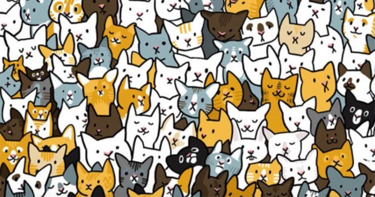 På bilden ser vi många katter. Men någonstans på bilden gömmer sig en söt liten kanin. Kan du hitta den på bilden nedan?
