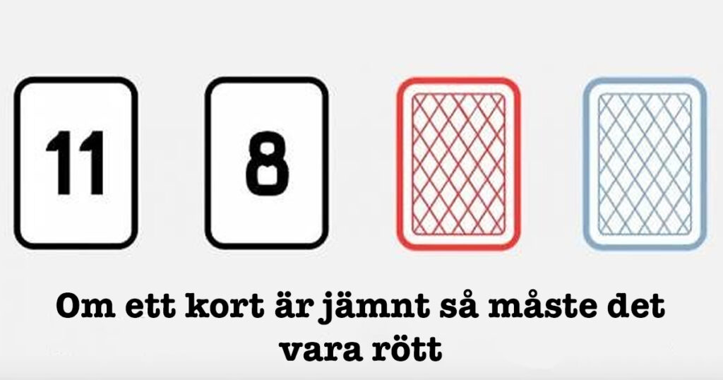 Du får sedan en regel – om ett kort är jämnt så måste det vara rött. För att bevisa det får du bara vända två kort. Vilka två skulle du vända på?