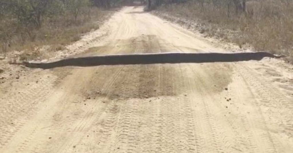 Till deras stora bestörtning fanns det ingen farthinder alls, utan en gigantisk pytonorm som låg avlångt över vägen.