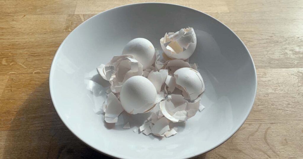 Det viktigaste först är att rengöra äggskalet så att det inte finns några rester av äggvita eller äggula kvar i skalet. Skölj skalet väl i vatten innan du torkar och krossar dem.