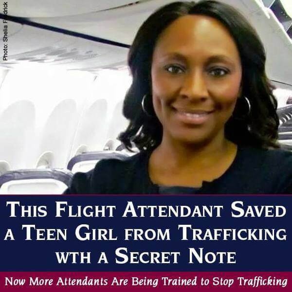 När den tappra flygvärdinnan såg detta gick hon direkt till piloten. Hon bad honom ringa polisen så att de kunde träffas på flygplatsen när de landade i San Francisco. Det visade sig senare att flickan på planet var ett offer för människohandel. Två månader före detta flyg hade hon blivit kidnappad!