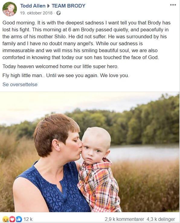 Det är med den djupaste sorg som jag kan meddela att Brody förlorade slaget. I morse klockan 06 somnade Brody tyst i sin mamma Silos famn. Han led inte. Han var omgiven av sin familj, och jag tvivlar inte på att det fanns många änglar där. Men vår sorg är outhärdlig och vi kommer att sakna hans leende vackra själ. Vi tröstar oss med att veta att vår son idag har rört vid Guds ansikte.
