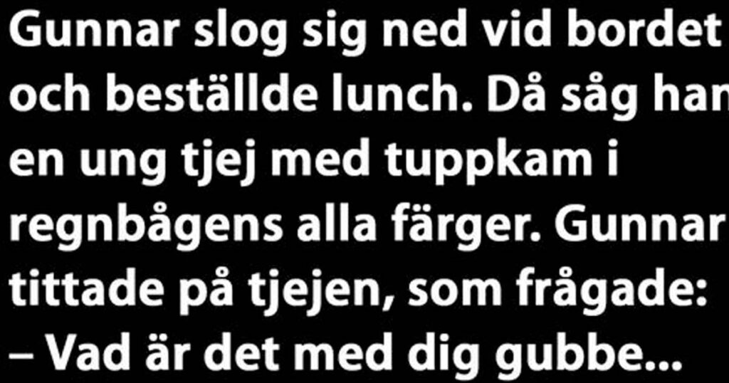Efter att han satt sig så upptäckte Gunnar en ung punktjej som satt vid bordet mittemot. Hon hade håret i en stor tuppkam i regnbågens alla färger. Gunnar tittade länge och väl på den unga tjejen.