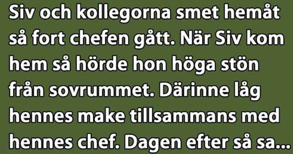 Då hörde hon plötsligt högljudda stön från sovrummet. Nyfiket smög Siv upp på övervåningen och gläntade på dörren. Där såg hon sin chef, som satt ovanpå hennes make och njöt för fulla muggar.