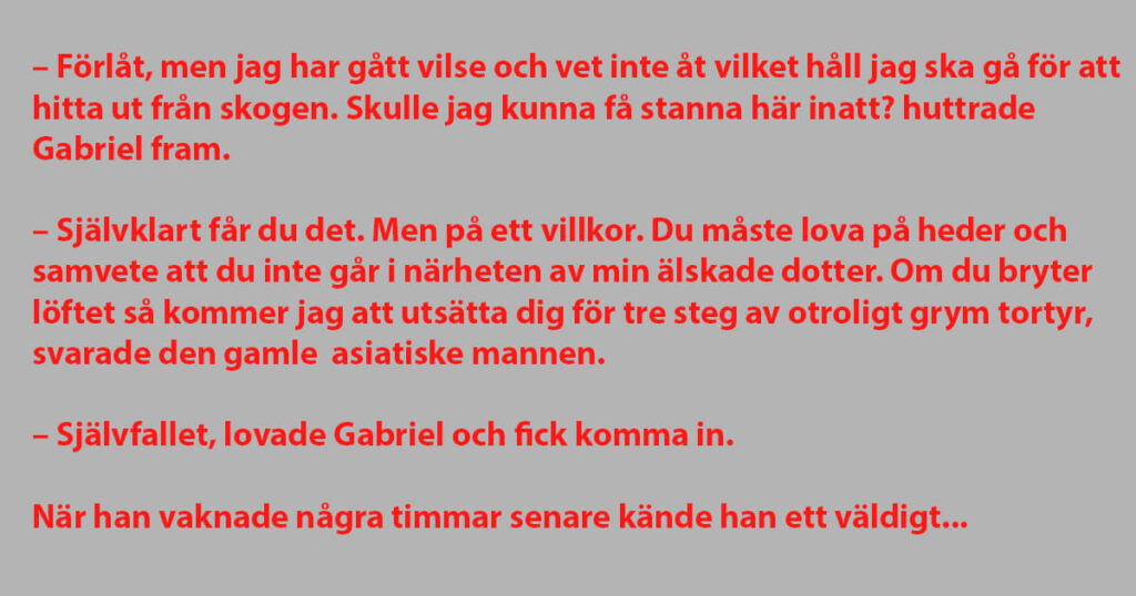 – Förlåt, men jag har gått vilse och vet inte åt vilket håll jag ska gå för att hitta ut från skogen. Skulle jag kunna få stanna här inatt? huttrade Gabriel fram.