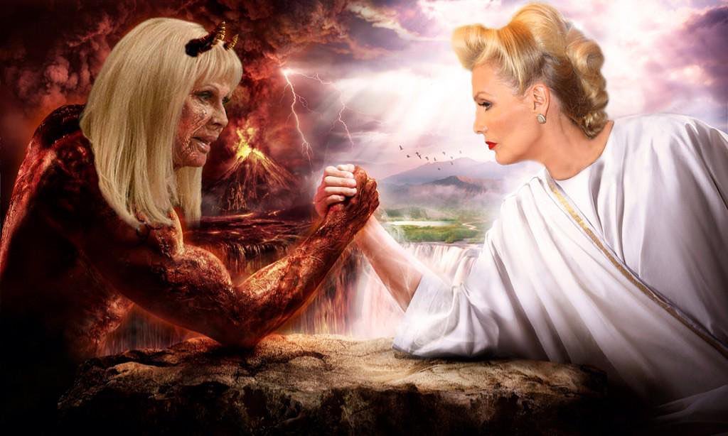 På bilden är Britt Ekland målad som en djävul medan Gunilla framställs som en ängel.