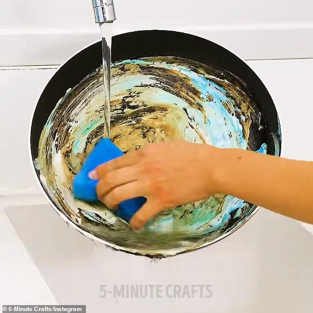 Slå nu på det varma vattnet på kranen och fortsätt att köra runt svampen i cirkulära rörelser tills det inte finns någon mer smuts på kastrullen. Det borde inte ta många sekunder.