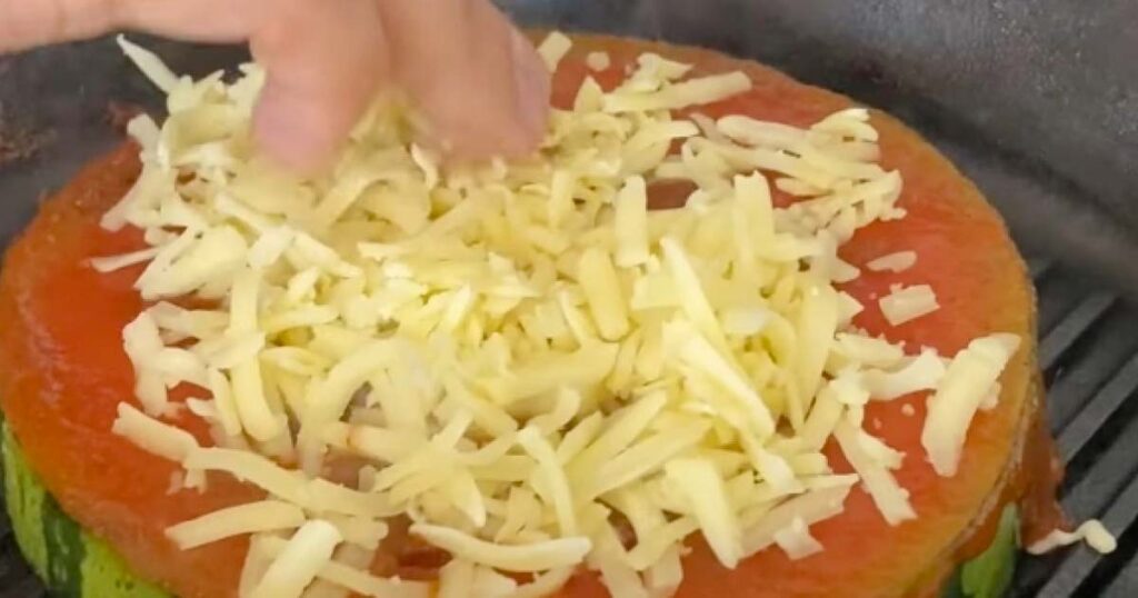 När vattenmelonen har stekts tillräckligt bra kommer barberquesåsen på ena sidan och när den är väl fördelad läggs ost och pepperoni på ’vattenmelonpizzan’.