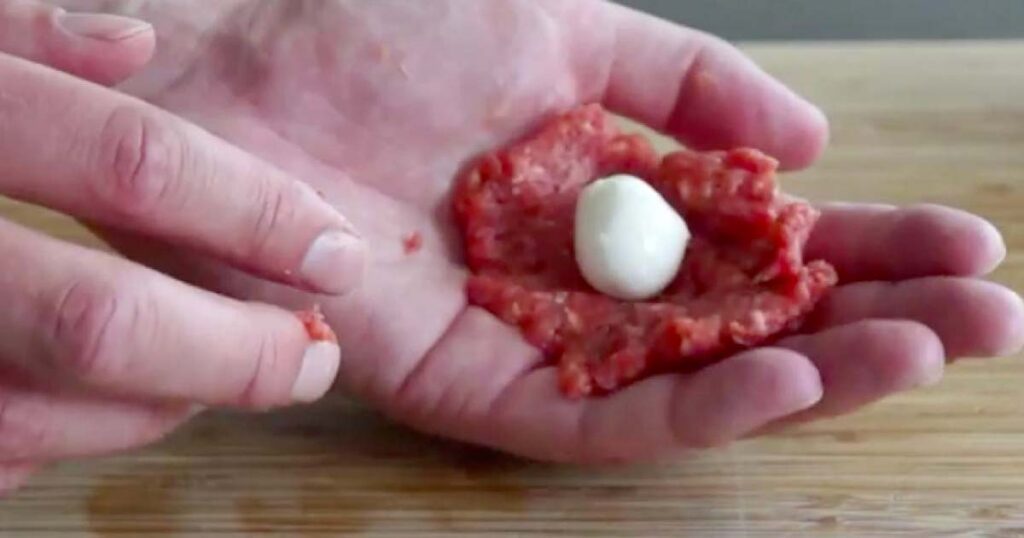 Mosa en platt ”biff” och lägg en mozzarellaboll i den. Linda fyllningen runt osten för att bilda en boll i storleken som en golfboll.