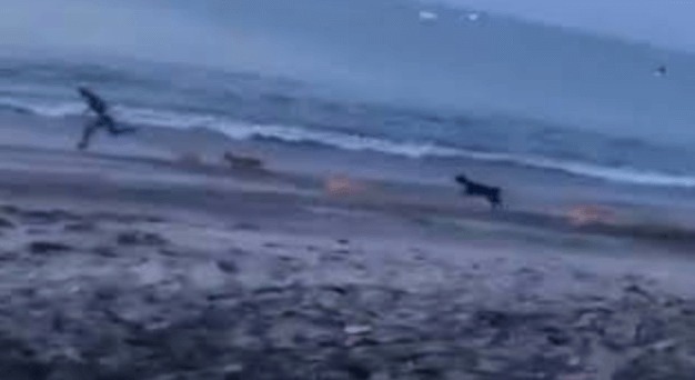Medan han jobbar sig tillbaka till fötterna kommer ett helt gäng herrelösa hundar och börjar jaga honom på stranden.