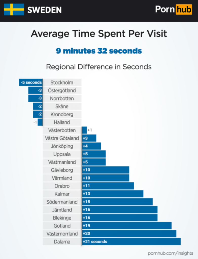 De har också – beroende på var man bor – kunnat ta fram en genomsnittlig besökslängd. Exempelvis är de totalt värdelösa i Stockholm och ligger 5 sekunder under snittet, medan de är helt galna och skogstokiga i Dalarna, som ligger på 21 sekunder över snittet!