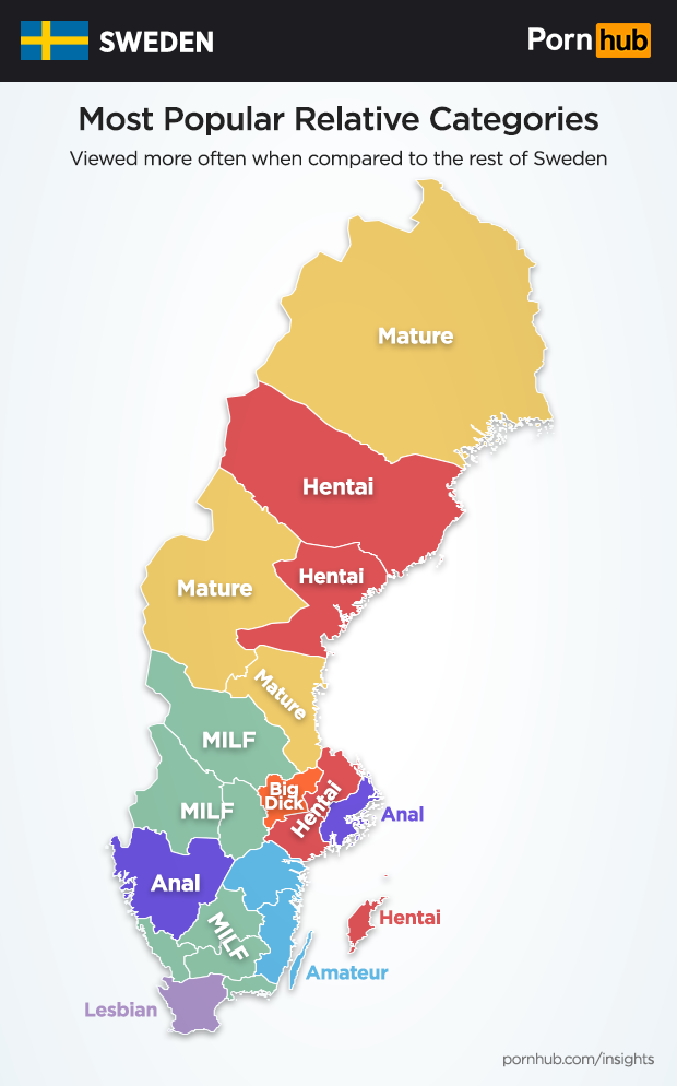 Vad som är nytt för i år är att Pornhub har ordnat fram en karta och placerat de mest populära kategorierna som söks efter mest beroende på vart i vårat avlånga land du bor!