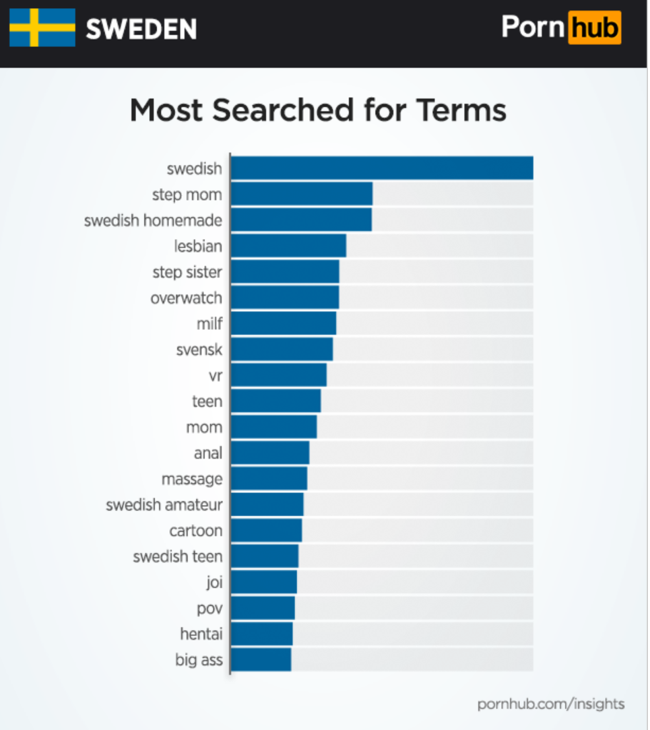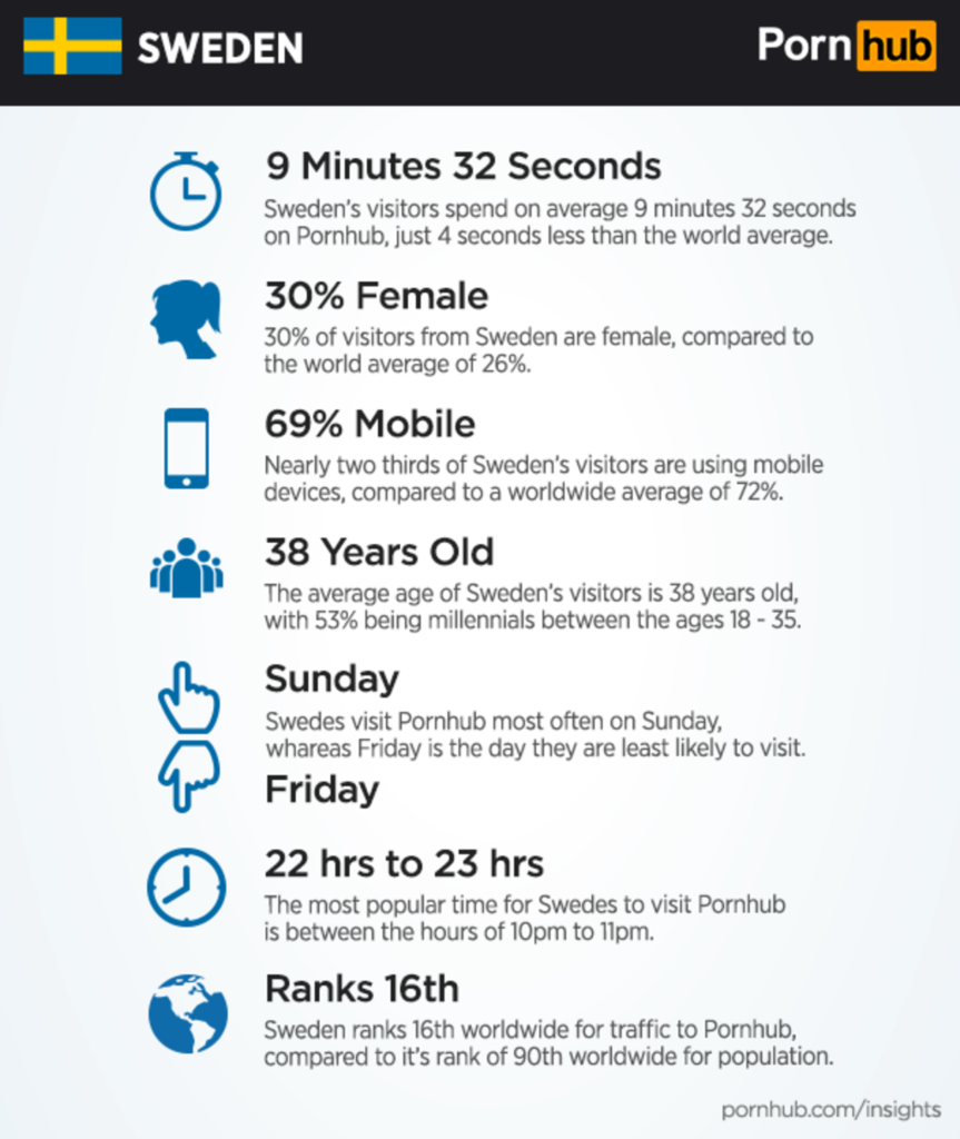 Kanske inte helt oväntat är det flest svenskar som surfar in på Pornhub mellan 22:00 och 23:00. Och uppenbarligen är vi svenskar vääääldigt porrglada, eftersom vi hamnar på en 16:e plats i världen som genererar flest besök till sajten.