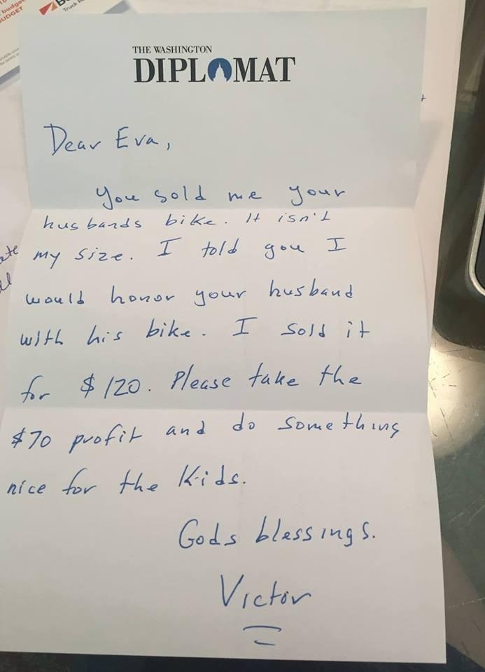 ”Kära Eva. Du sålde mig din mans cykel. Den var dock inte min storlek. Jag lovade dig att jag skulle hedra din man med hans cykel. Jag sålde den vidare för 120 dollar (1 300 kronor). Vänligen acceptera vinsten på 770 kronor och spendera det på något bra för dina barn. Victor.”