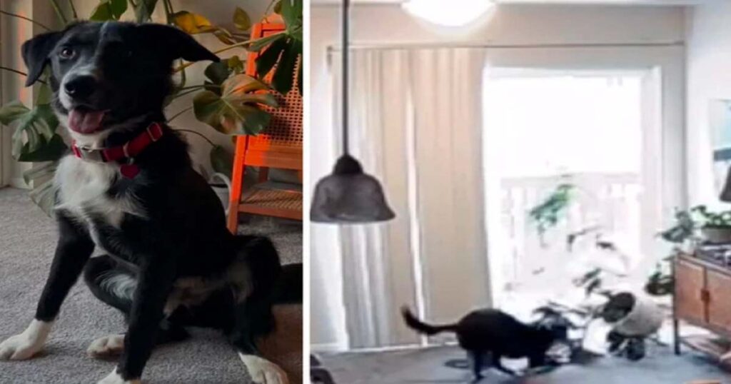 Den unge amerikanen lade också till videon med en övervakningskamera från sitt vardagsrum. För att se hur hunden kastar sig på plantan, river av blomkrukan och börjar sina vilda aktiviteter.