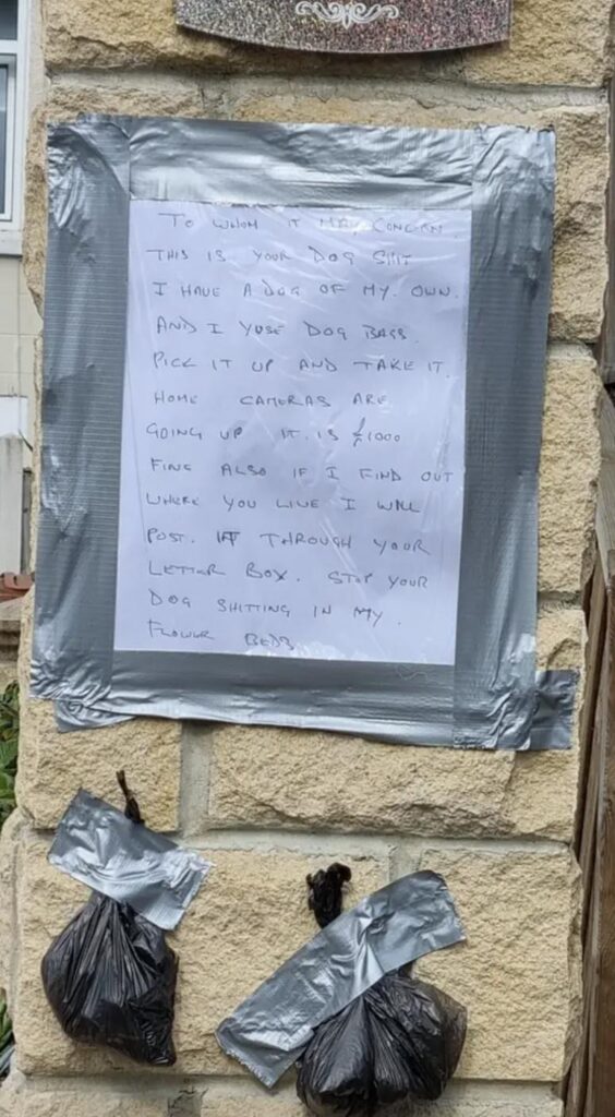 ”Jag ska också kasta den genom din brevfack om jag får reda på var du bor – få din hund att sluta skita i mina rabatter.”