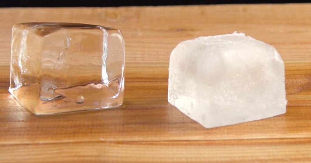När du kokar vatten frigörs en del av luften (ännu mer när du kokar det två gånger), men du kan inte bli av med allt. När isen fryser trycker den ut dessa små bubblor och föroreningar – så om man kunde få isen att frysa i en riktning skulle all grumlighet tryckas till en plats som man lätt kan ta bort.