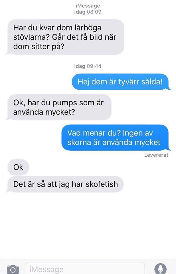 – Jag fick ett sms där någon frågade om jag kunde skicka en bild på skorna när jag hade de på mig. Jag berättade att de var sålda när personen smsade igen och frågade om jag hade mycket skor som var använda. Jag visste inte riktigt vad personen menade men fick som svar tillbaka att personen hade skofetish, säger Josephine till Nyheter24.