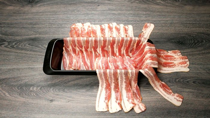 1. Ta fram en avlång brödform och klä in den i bacon, som bilden nedanför visar. Baconet ska hänga utanför.