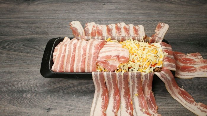 8. Om du inte har lyckats att nå överkanten med dina ingredienser ännu så kan du upprepa det du gillar mest flera gånger om. Glöm inte att lägga tortillabröd emellan lite då och då för stabilitetens skull. Därefter viker du bara över baconet som på bilden nedanför!