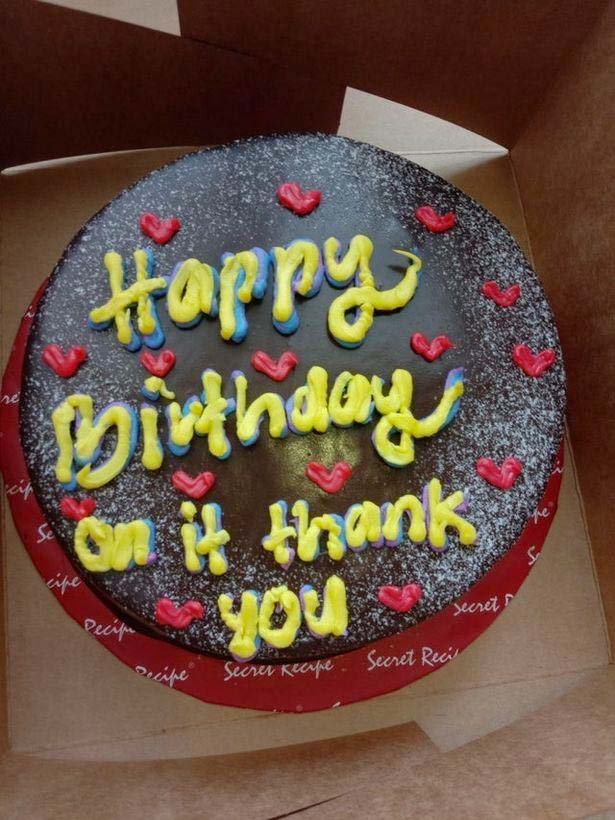 Istället för att vara nöjd med födelsedagen och personens namn hade bagaren valt att skriva ’Happy Birthday on it thanks’ (Grattis på födelsedagen på det tack, red.)
