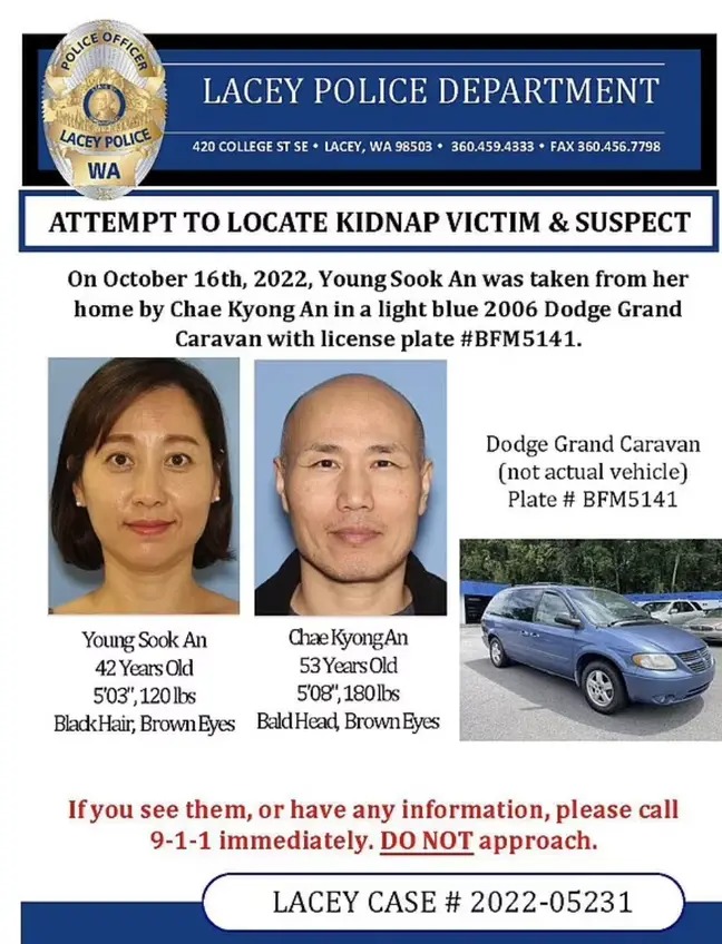 Söndagen den 16 oktober, runt 01:00, ska Young Sook An ha blivit bortförd av sin man, Chae Kyong An, från sitt hus i viss mening i Washington, USA.