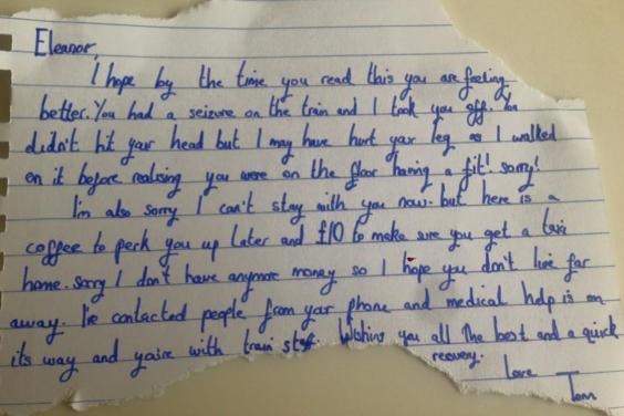 ”Hej Eleanor. Jag hoppas att du mår bättre när du läser detta. Du fick ett anfall på tåget och jag bar iväg dig”, skriver Tom.