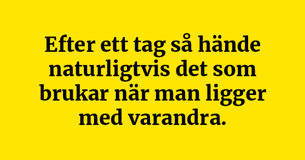 Men han hittade ingen. Hur är det nu då. Nöden har ingen lag tänkte han. Han öppnade kylskåpet där han hade en korv. Han tog korven och pressade ur köttet ur skinnet. Trädde skinnet på snoppen och in till den blivande bruden i sängen.