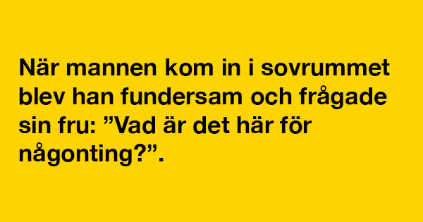 När mannen kom in i sovrummet blev han fundersam och frågade sin fru: ”Vad är det här för någonting?”.