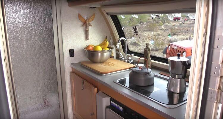 Den innehåller ett kök med ett litet tre-i-ett-kylskåp som går på propan, plug-in-ström eller ett batteri, en diskho med skärbräda och en tvålågig spis. Hon gillar dock ofta att laga mat ute.