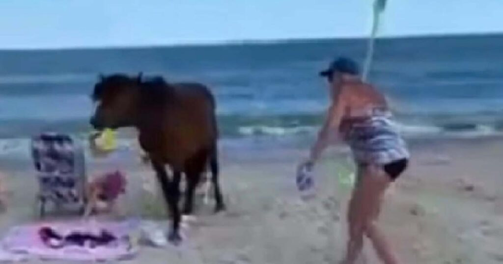 Kvinnan slår till den vilda hästen som springer in på stranden: sekunder senare ångrar hon sig djupt