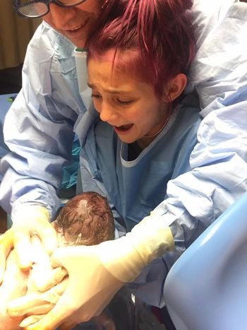 Det här är Dedes dotter, hon är bara 12 år och heter Jacee. Hon fick komma in i rummet, men var inte beredd på att hon skulle få uppleva förlossningen på detta sätt.