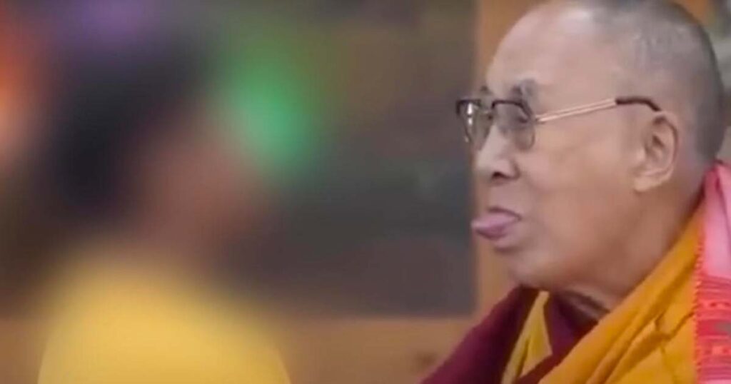 Dalai Lama tar sedan tag i pojkens käke och kysser honom på munnen, varefter han säger: ”Och sug på min tunga” och håller fram tungan.