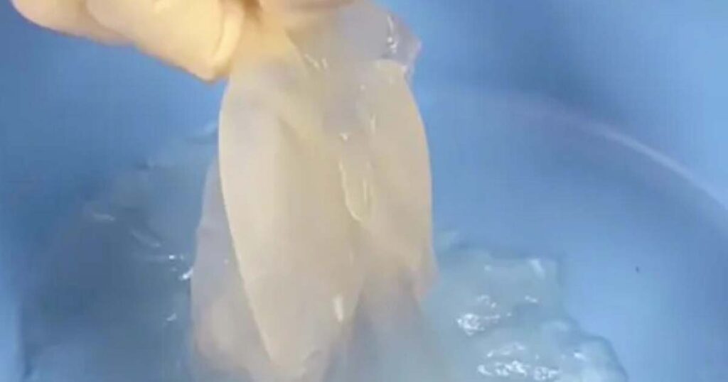 Han klipper sedan den nya med en sax utan att något av gelén ramlar ut – och istället behöll den formen.